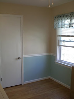 Here are some pics of the room - when it was our guest room it was pretty plain and painted a lilac color. Mike was able to paint the ceiling, install a new ceiling fan and paint the walls (antiguan sky and lambskin if you're wondering). :) He also painted both of her doors, put new hardware on them and put up a chair rail. He's quite the handyman!